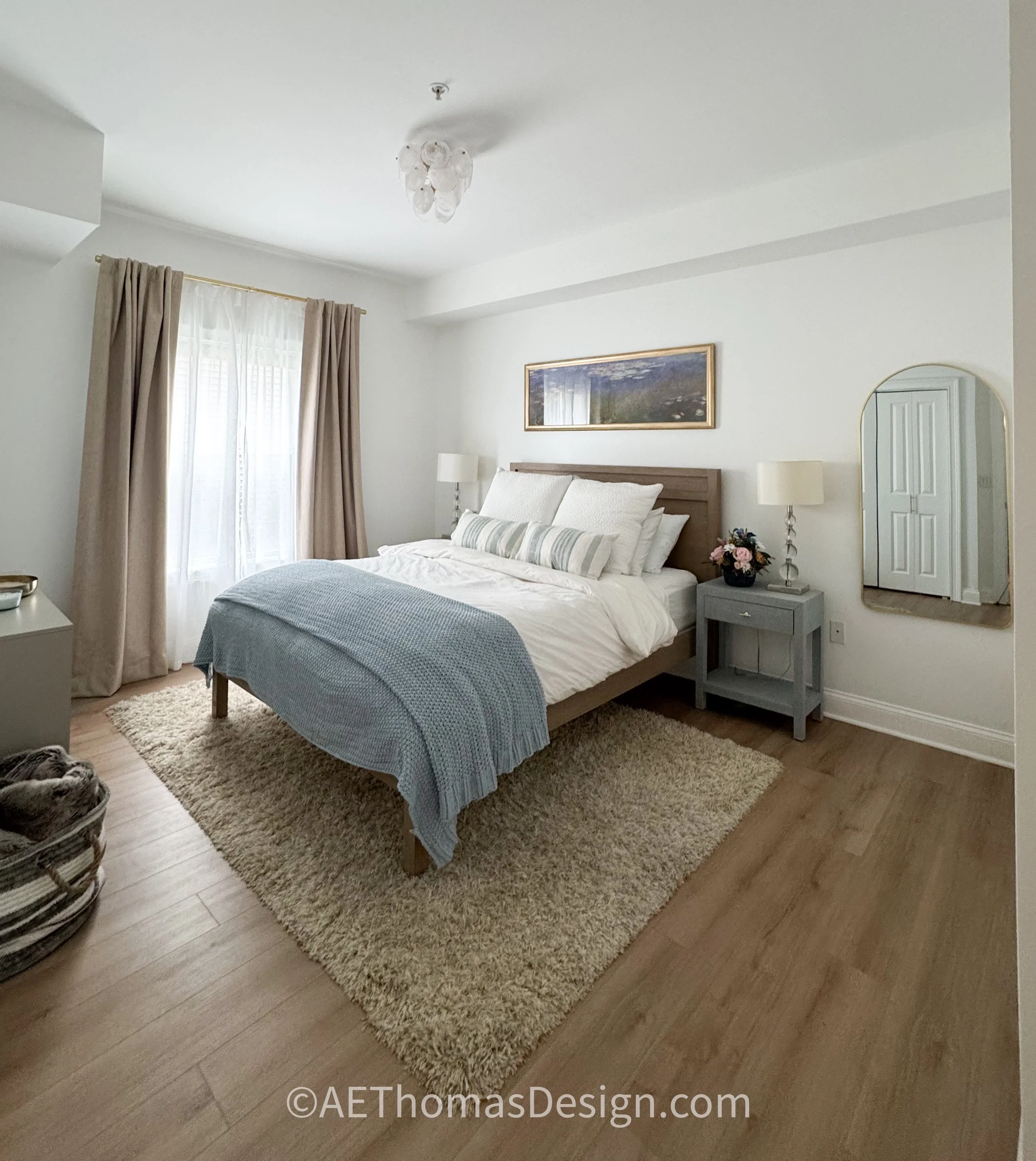 A great layout, location, and beautiful natural light were what drew the new owner of this condo to it, but the sea of dark brown floors and cabinets drained the life from the space. A makeover was in order to reflect the new owner’s personal style. All new flooring lightened the space and made it feel more cohesive. Paint made a huge difference in this project, a brilliant blue accent color for the full height and lower cabinets, and a new island set the tone for the home. Crisp whites and neutral tones were added as a contrast to the blue tones. New light fixtures gave more overall light and style. The primary bedroom, guest bedroom, and bathroom all look totally different with new paint, floors, and lighting. This condo is more than just the Saratoga place to be!
